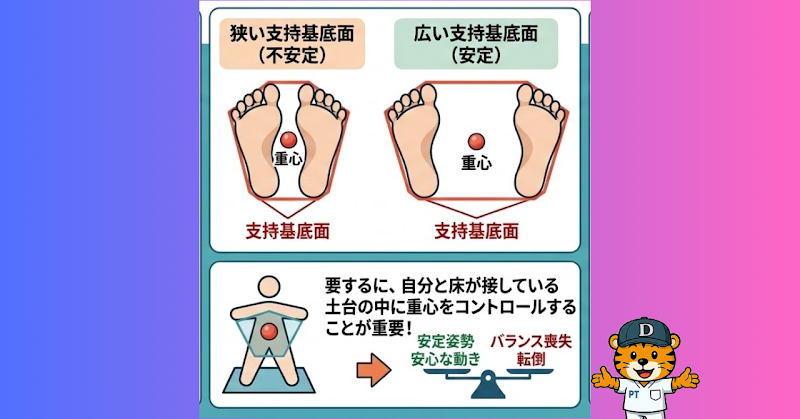 要するに、自分と床が接している「土台(支持基底面)」の範囲内に、身体の重さの中心である「重心」をキープし続ける能力のことです。