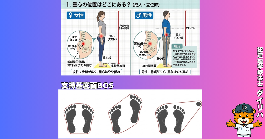動作分析で迷ったら、まずは「患者さんのBOS(土台)はどうなっているか?」「COM(重心)は今どこにあるか?」をイメージしてみてください。それだけで、姿勢の崩れる原因を考える幅が広がってきます。