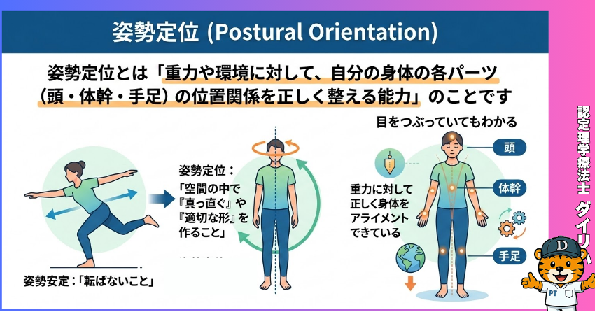 結論から言うと、姿勢定位とは「重力や環境に対して、自分の身体の各パーツ(頭・体幹・手足)の位置関係を正しく整える能力」のことです。