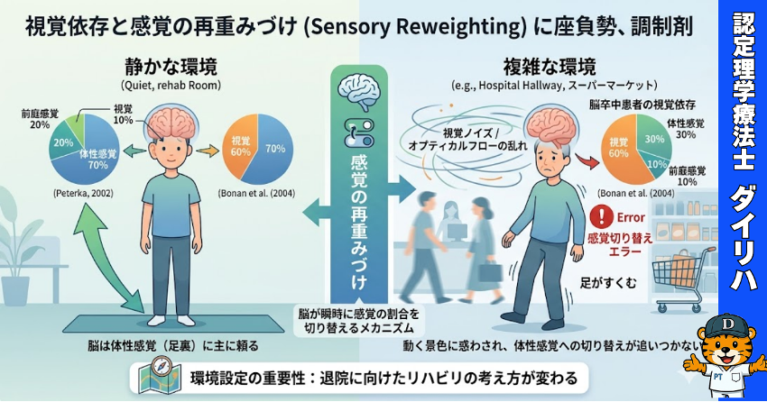 この「視覚依存」と「感覚の切り替え」という視点を持つと、退院に向けた病棟での歩行練習や、「どんな環境で練習すべきか?」という設定の考え方が大きく変わってきますよ。