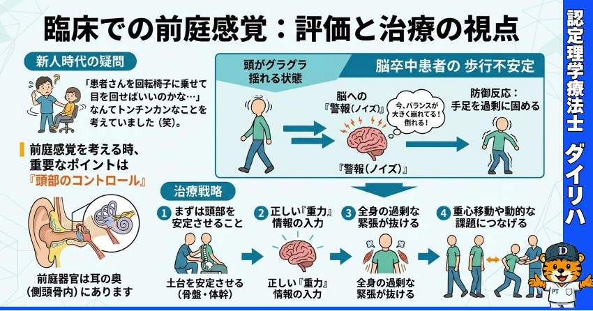 でも、「じゃあ実際の臨床でどうやって前庭感覚を評価して、治療につなげるの?」って思いますよね。正直、僕も新人時代は「患者さんを回転椅子に乗せて目を回せばいいのかな…」なんてトンチンカンなことを考えていました(笑)。