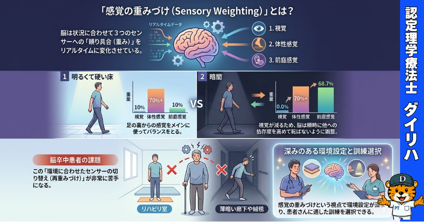 でも、夜中に電気をつけずにトイレに行く時(暗闇)はどうでしょう?「視覚」からの情報が極端に減るため、脳は瞬時に視覚への依存度を下げ、代わりに「前庭感覚」や「体性感覚」の重み(割合)をグッと増やして転ばないように調整します。