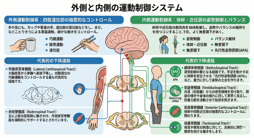 一方の内側運動制御系は、主に体幹や四肢近位部の筋肉をコントロールし、姿勢の維持やバランスを保つためのシステムです。多くの場合、意識に上らない無意識下での姿勢調節に関与しています。