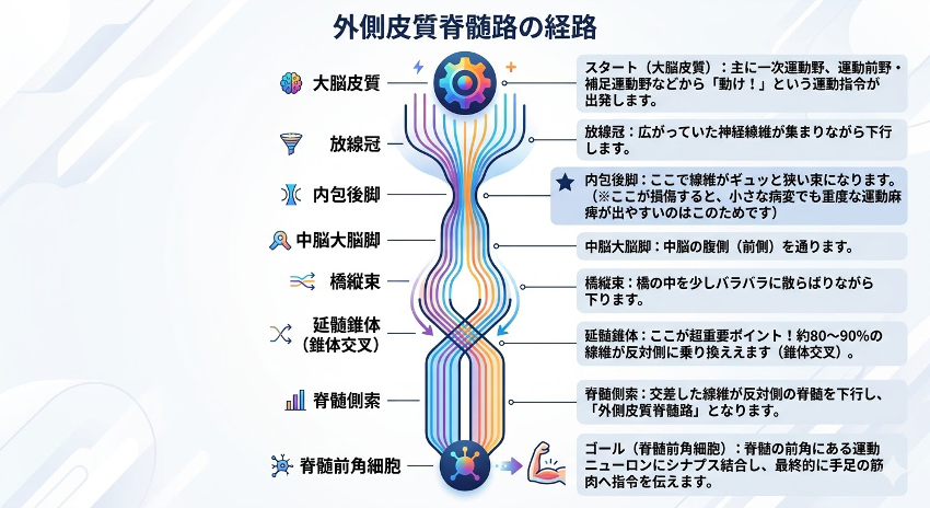 - 延髄錐体: ここが超重要ポイント!約80〜90%の線維が反対側に乗り換えます(錐体交叉)。