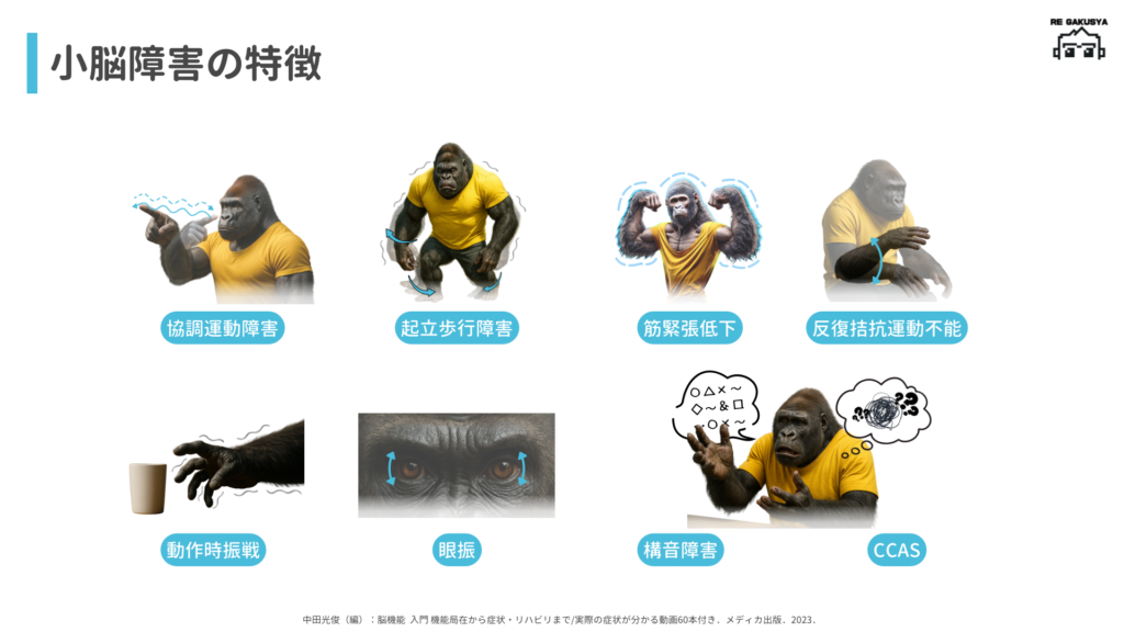 Eric .R.Kandel(編):カンデル神経科学 第2版,メディカル・サイエンス・インターナショナル,2022. シェイクマン、ボウマン、他:臨床神経科学とリハビリテーション.西村書店,2020. 宇川義一(編):運動失調のみかた, 考えかた-小脳と脊髄小脳変性症-.中外医学社、2017. 近藤夕騎:小脳・脳幹の多彩な臨床症状の評価と理学療法.理学療法ジャーナル; 58;1122-1129,2024.