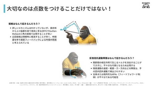 ただし臨床で重要なのは、単に点数をつけることだけではありません。小脳障害では企図振戦や分解運動、反復拮抗運動障害など、運動の質に特徴的な変化がみられます。そのため評価ではテスト結果だけでなく、リーチや把持など実際の動作の中で、運動の軌道や修正動作を観察することが大切になります。