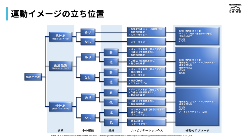 運動イメージは、エビデンスのある補助的アプローチの一つです。急性期〜慢性期まで幅広く適応可能で、他の介入と組み合わせて用いられることが多いのが特徴です。
