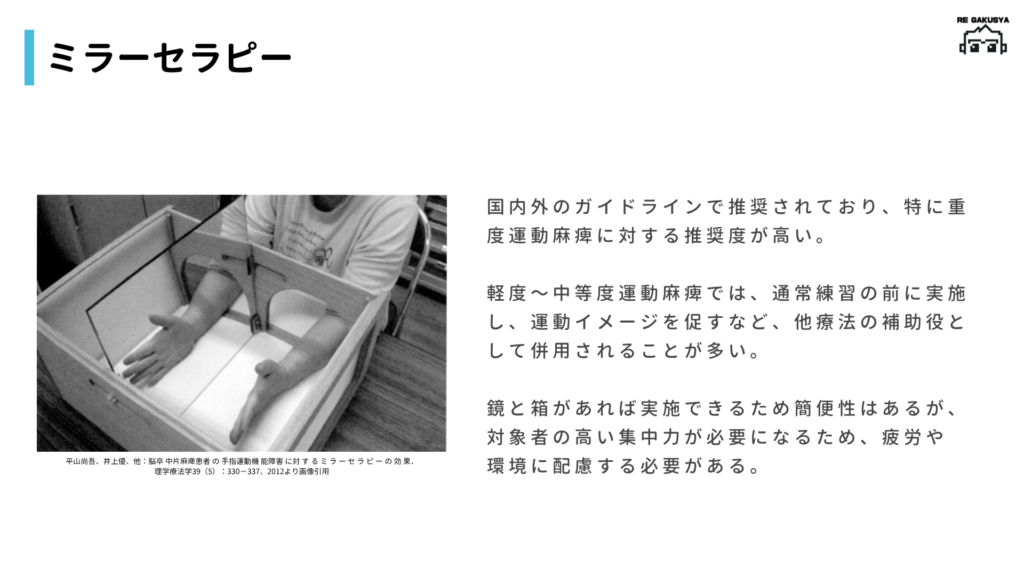 平山尚吾、井上優、他:脳卒 中片麻痺患者 の 手指運動機 能障害 に対 す る ミ ラ ー セ ラ ピ ー の 効 果.理学療法学39(5):330−337、2012.
