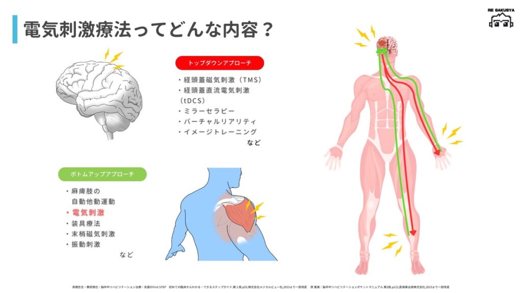 電気刺激はボトムアップアプローチに位置づけられ、筋や神経への刺激を通して感覚入力を増加させ、中枢神経系に影響を与える手段です。