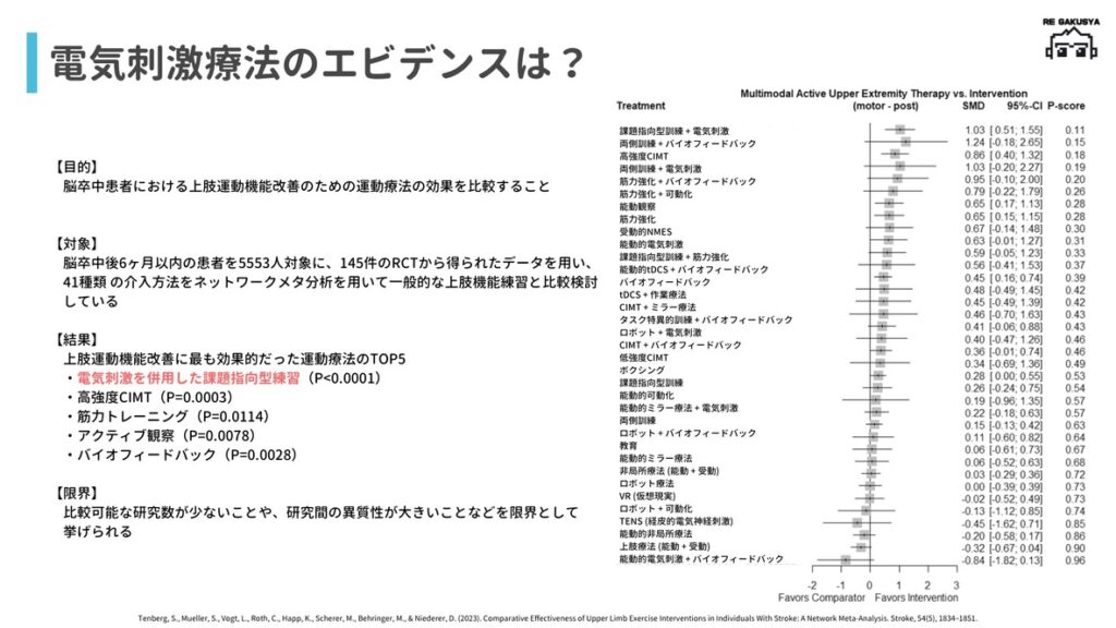 原 寛美:脳卒中リハビリテーションポケットマニュアル.第2版.p122,医歯薬出版株式会社,2023. Tenberg, S., Mueller, S., Vogt, L., Roth, C., Happ, K., Scherer, M., Behringer, M., & Niederer, D. Comparative Effectiveness of Upper Limb Exercise Interventions in Individuals With Stroke: A Network Meta-Analysis. Stroke, 54(5), 1834–1851.2023.