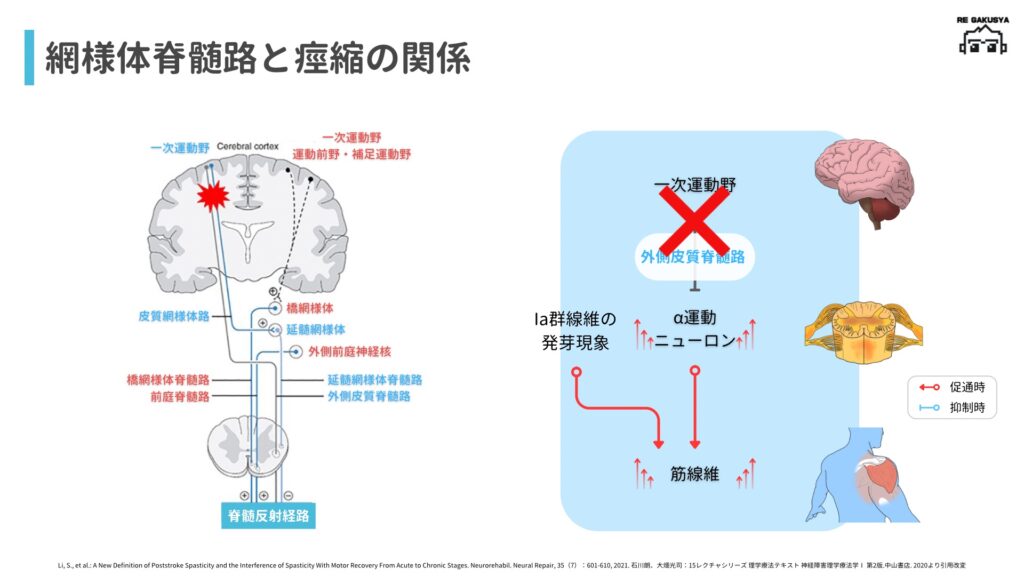 手指の細かな運動を担う皮質脊髄路は、この抑制を含めた調整に重要な役割を持っています。 これが損傷すると抑制が弱まり、広い範囲の筋活動をまとめて促通しやすい網様体脊髄路の影響が強くなります。
