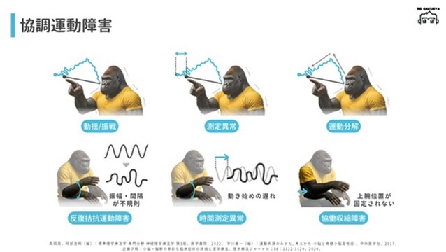 そのため小脳やそれに関連する経路が障害されると、リーチで目標を行き過ぎたり(過大)、逆に届かなかったり(過小)する「測定障害」や、動きが分解されてぎこちなくなる協調運動障害が起こります。